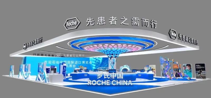 沉浸式交互展台如罗氏。罗氏以"引领创新,守护生命"为主题,通过"生命穹顶"的艺术呈现,沉浸式展示医疗创新与人文关怀的深度交融,诠释罗氏坚持创新、守护生命的初心和使命。