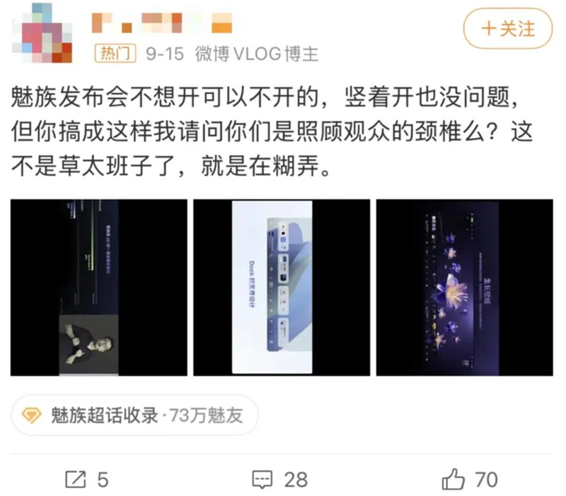 更尴尬的是,当介绍到Flyme Auto车机系统时,PPT变成了横屏——但直播画面却没有切换!导致出现超大黑边。整场发布会在“竖屏直播+横屏内容”之间反复切换,观众也不得不跟着频繁扭头或旋转屏幕,体验感受大打折扣。